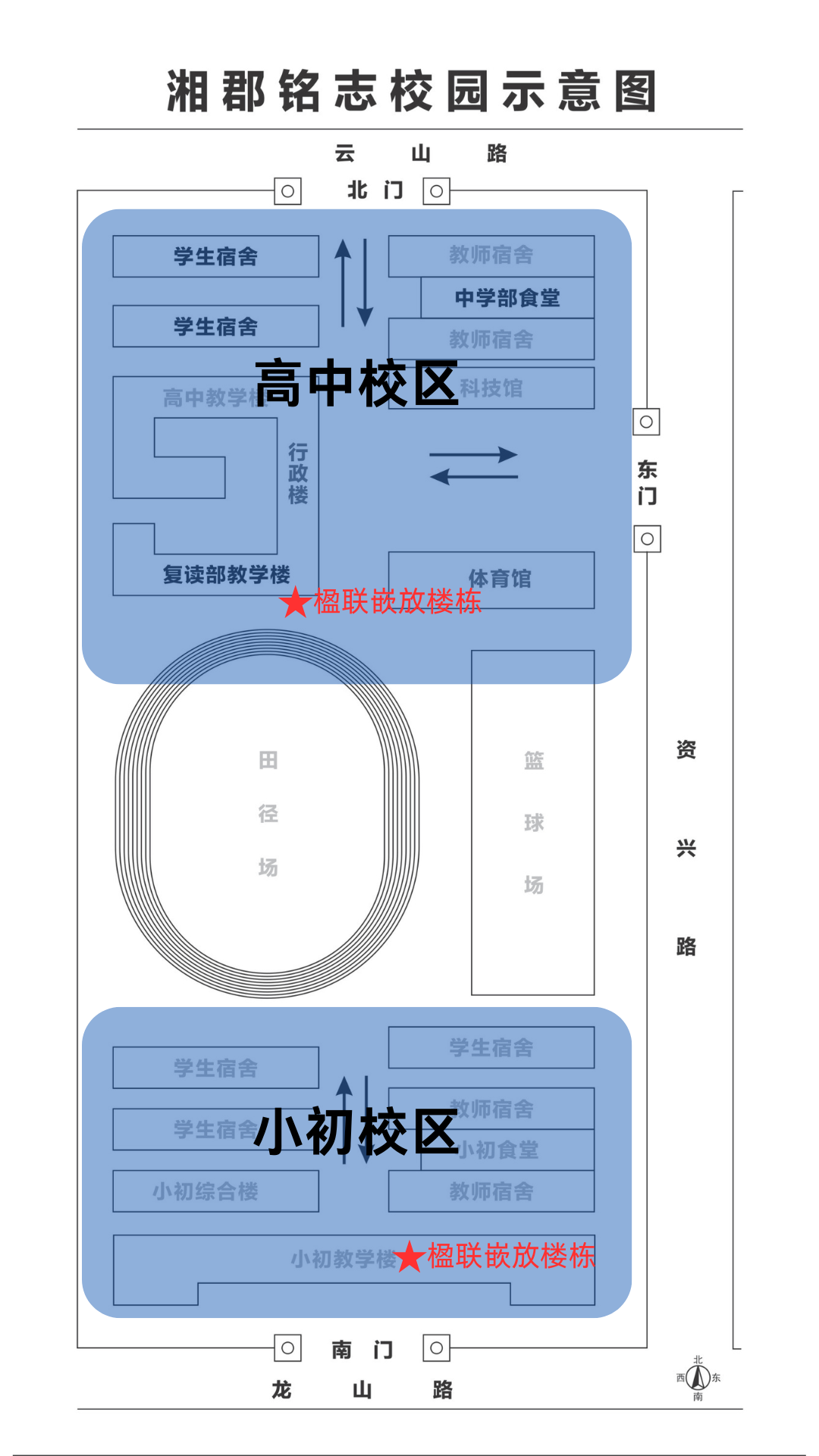 学校平面示意图 小初校区:标蓝部分为楹联嵌放处 高中校区:标蓝部分为楹联嵌放处