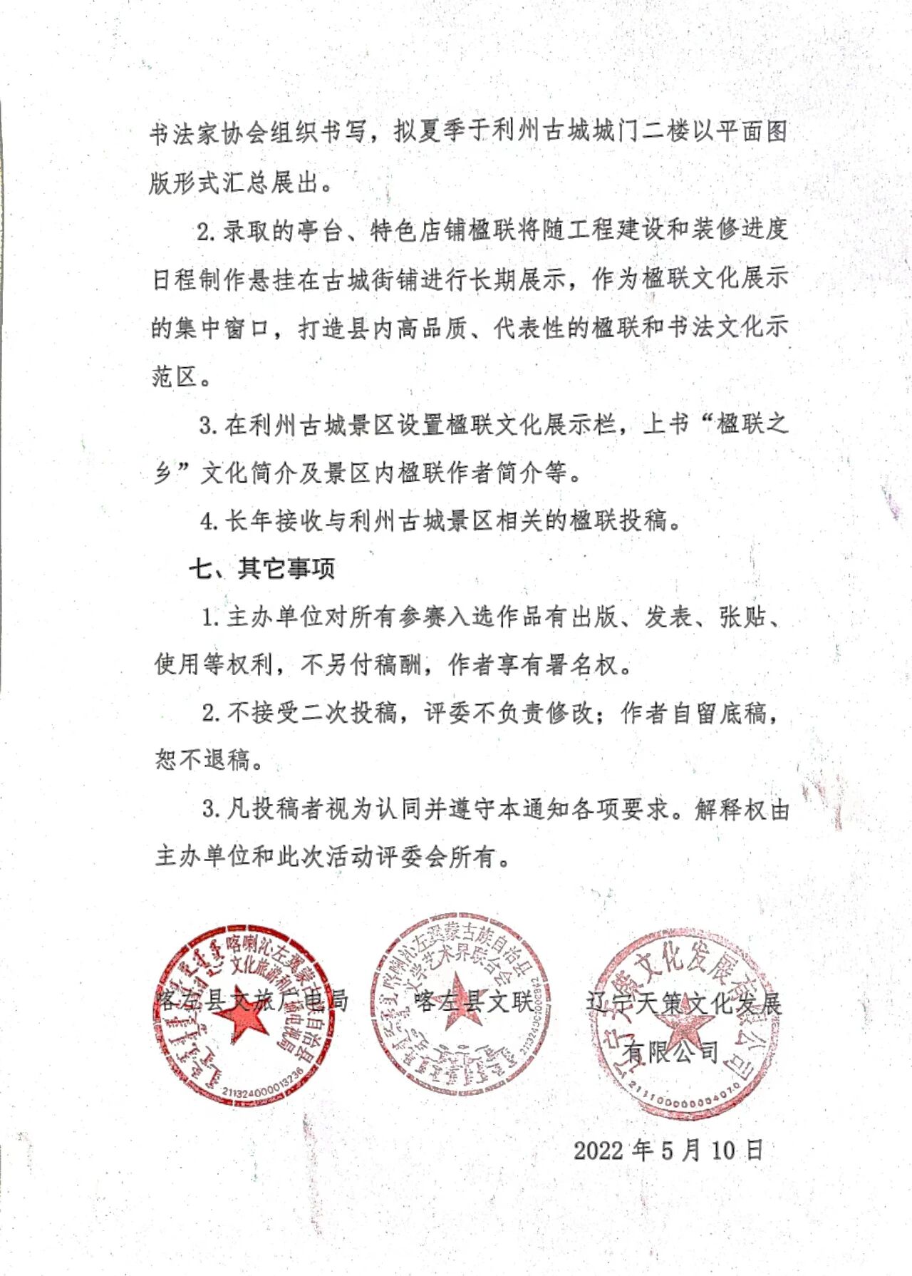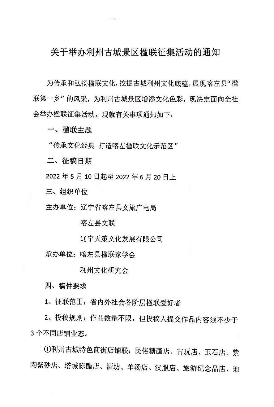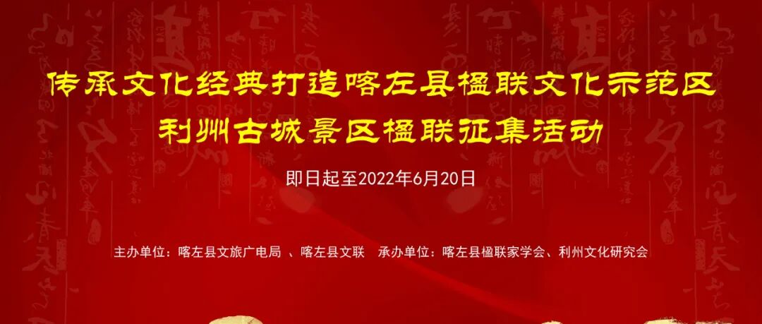 利州古城景区楹联征集活动,全面开启! 利州古城 2022-05-16 16:03 为传承和弘扬楹联文化,挖掘利州文化底蕴,展现喀左县“楹联第一乡”的风采,为景区增添文化特色,由喀左县文旅广电局、喀左县文联主办,喀左县楹联家学会、利州文化研究会承办的楹联征集活动即日开启,截至2022年6月20日,面向省内外社会各阶层楹联爱好者广泛征集景区店铺楹联,欢迎大家踊跃参与!