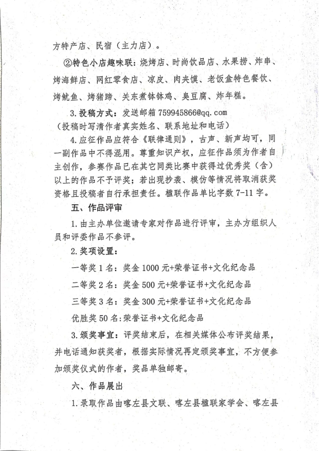 五、征联作品要求: 此次征联评选将增大趣味性、创新性分数比重,鼓励创作活泼、丰富展现店铺特色的楹联作品 1、应征作品应符合《联律通则》,古声、新声均可,同一作品中不得混用。 2、尊重知识产权,应征作品须为作者自主创作,参赛作品已在其它同类比赛中获得过优秀奖(含)以上的作品不予评奖;若出现抄袭、模仿等情况将取消获奖资格且投稿者自行承担责任。 3、主办单位对所有参赛入选作品有出版、发表、张贴、使用等权利,不另付稿酬,作者享有署名权。 4、不接受二次投稿,评委不负责修改;作者自留底稿,恕不退稿。 5、主办方组织人员和评委作品不参评。 6、楹联作品单比字数7-11字。 所有参赛作者视同同意以上条款,解释权由主办单位和此次活动评委会所有。