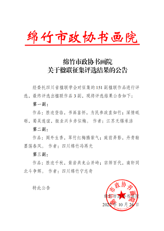 [赛事揭晓] 绵竹市政协书画院关于楹联征集评选结果公告