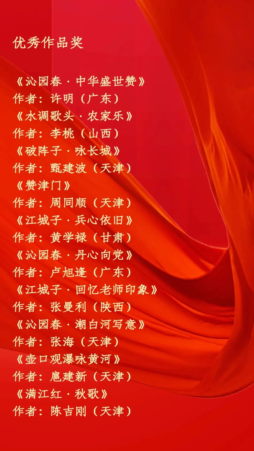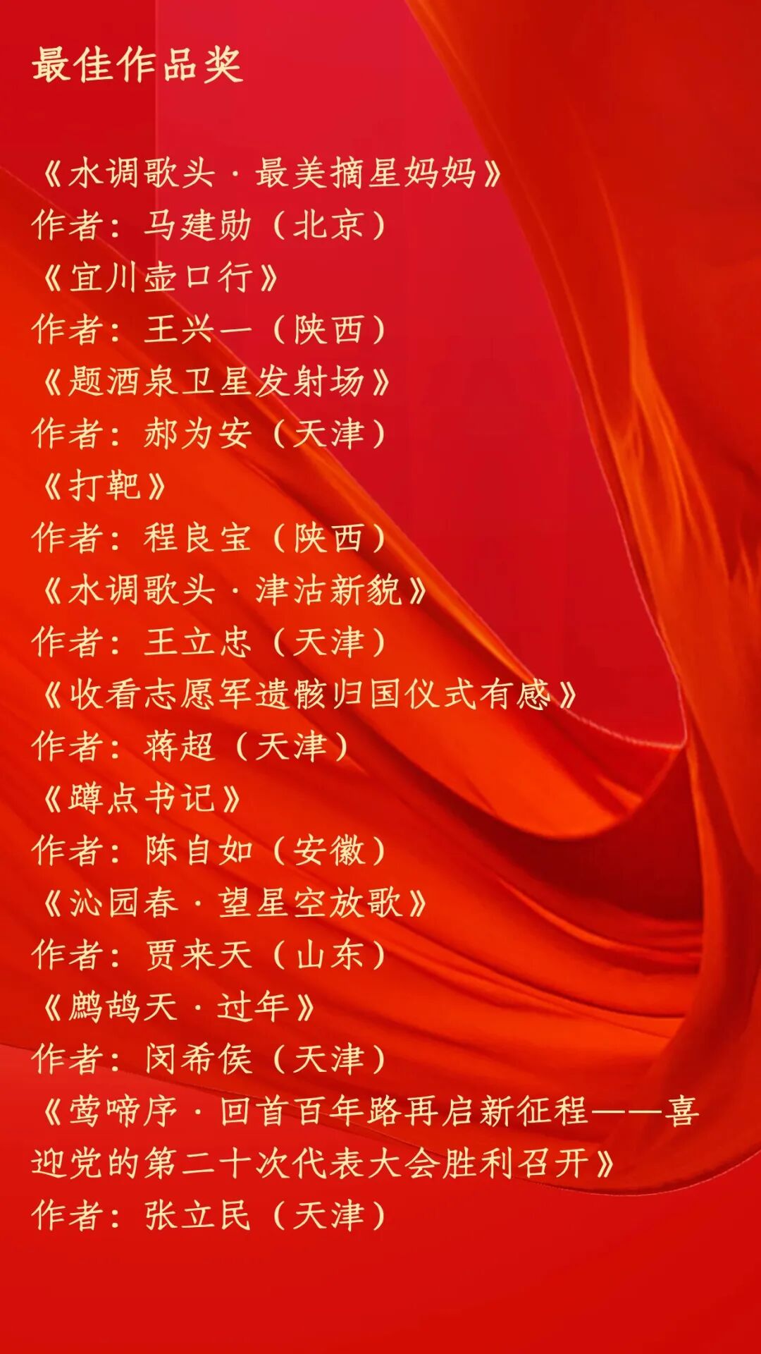 活动于今年5月启动,面向全国业余古体诗词爱好者征稿,共收到来自28个省直辖市、自治区报送的600余名作者的977篇作品。经严格评选,马建勋(北京)、王兴一(陕西)、郝为安(天津)等10名作者的诗、词作品获最佳作品奖;许明(广东)、李桃(山西)、甄建波(天津)等10名作者的诗、词作品获优秀作品奖。天津市西青区文化馆、天津市宝坻区文化馆、广东省深圳市文化馆等13家单位获优秀组织奖,王之昱(天津市武清区文联)、杜染(北京市文化馆)、吴珏(湖南省文化馆)等20人获个人优秀组织奖。