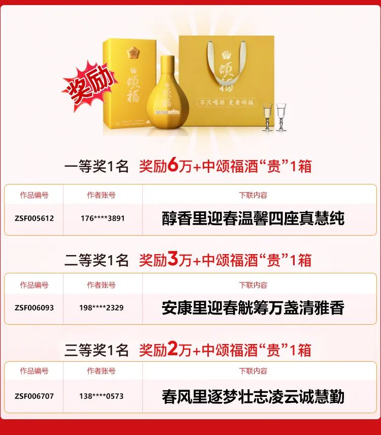 “中颂福酒,为福而生!” “不只喝酒,更要颂福!” 本着为人民“福”务的使命,中颂福酒于2022年11月16日发起了“中颂福-集福春联征集大赛”,活动截止至2022年12月31日,历时46天,共有8133人参赛,共收到下联投稿10677份。