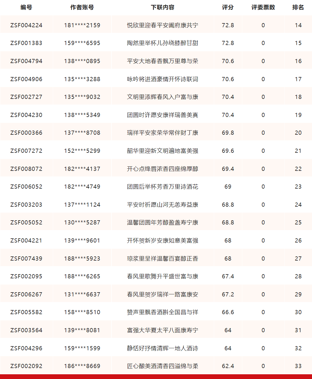 共33份“原创优秀集福春联”获奖,含颂福状元奖3名、颂福举人奖10名、颂福秀才奖20名(原定秀才奖30名,但剩余作品均不符合评审意见,故此仅有20名获奖),具体名单如下:
