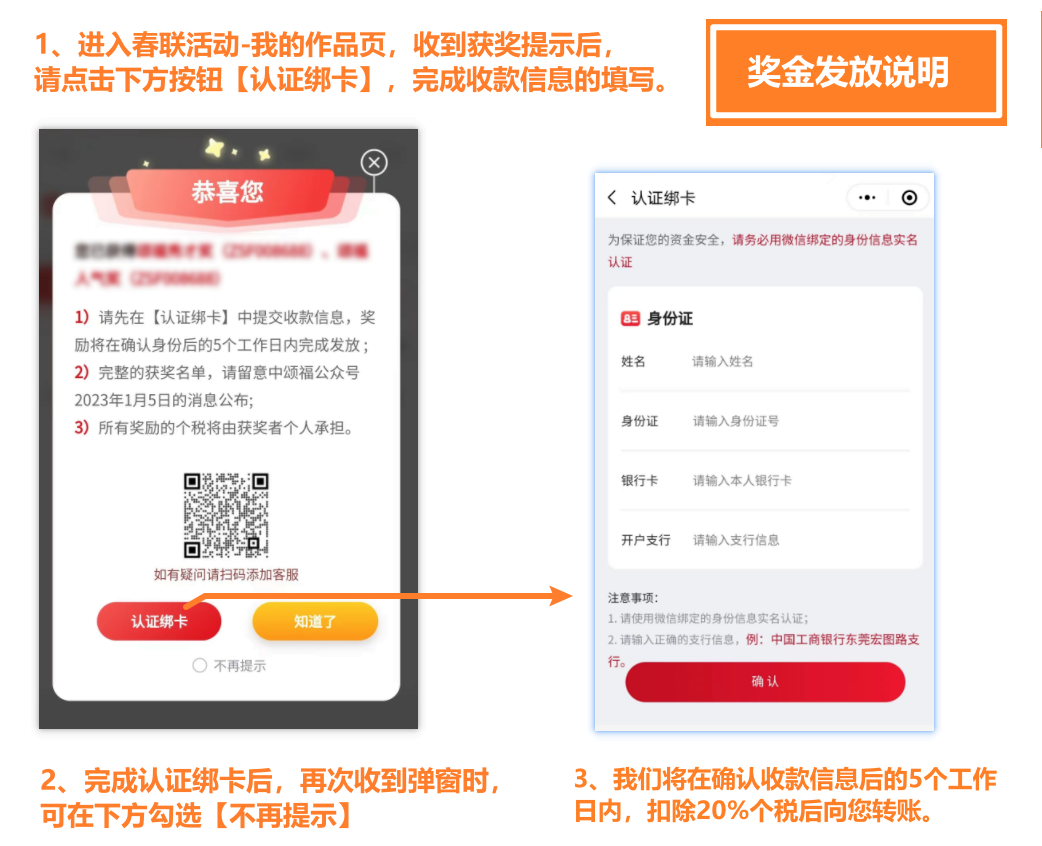 线上颁奖:颂福举人奖、秀才奖、人气奖、成就奖、先锋奖的获奖者,在打开中颂福小程序【春联活动-我的作品】页时将收到【获奖提示弹窗】,请根据下图指示通过认证绑卡,完成收款信息的填写: