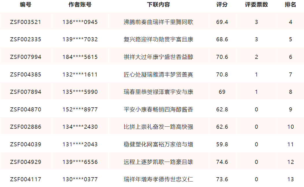 平台在1月2日晚上将候选人获奖名单公布于中颂福公众号,接受社会公众的监督,以防存在抄袭、盗用他人作品等纠纷出现。在1月2日~1月5日的3天公示期内,共收到86人的咨询反馈,其中作品申请复议38位,投诉15位,提出建议6位,平台客服均已耐心回复,并在评委老师的协助下逐一完成解答。公示完毕后,现在我们向全国广大参赛者和福友们正式公布获奖名单。